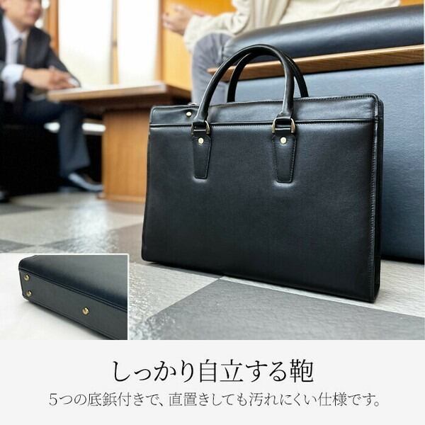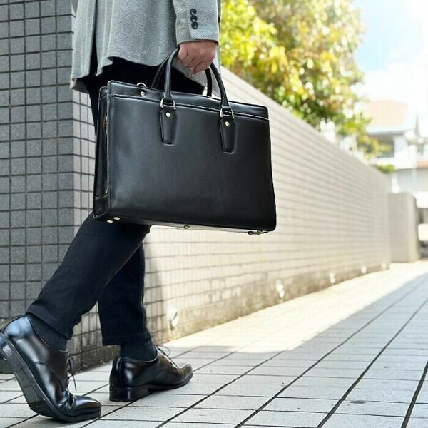 A4ファイル対応で、書類やノートPCの持ち運びにも最適。大きく開く設計で中身が見やすく、さらにしっかり自立するため、会議や移動時にも便利です。落ち着いたデザインが品格を引き立て、持つ人をより魅力的に演出します。